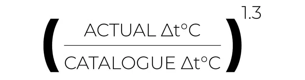 We now have to account for the non-linear relationship between MW-AT and the heat output of radiators, which you might remember features an exponent of 1.3,. However, we're working the other way around here. So rather than going from ∆T difference to the power increase, we're going from the power increase to the ∆T. So we'll have to use the reciprocal of 1.3.